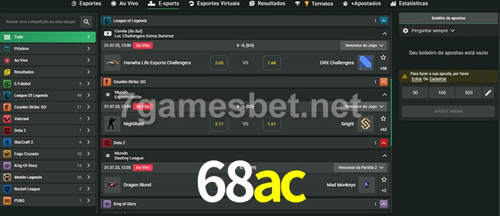 O 68ac oferece uma grande seleção de opções de apostas em e-sports com probabilidades competitivas